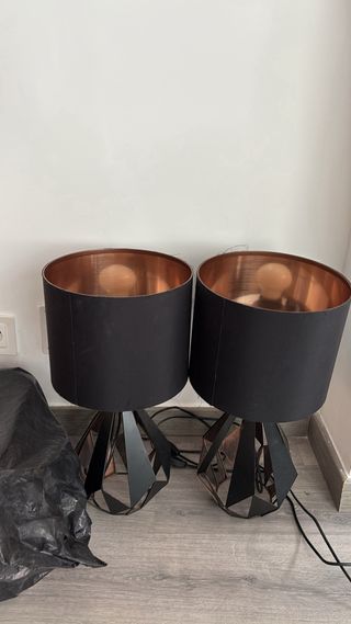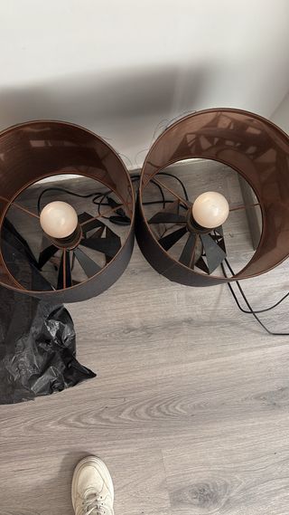Par de lámparas de mesa con un diseño moderno y elegante. - Pantallas de tela en tono marrón. - Base y estructura metálica. - Bombilla incluida.