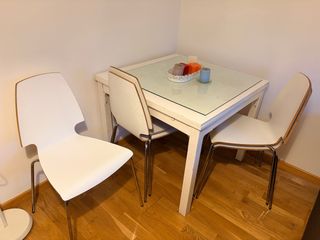 Conjunto de mesa extensible de IKEA con cinco sillas blancas. - Mesa blanca. - Sillas blancas con detalles en madera y patas metálicas. Tiene algunos roces, las sillas están en muy buen estado, solamente están sucias.