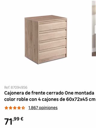 Cajonera de frente cerrado con 4 cajones, color roble. Sus medidas son 60x72x45 cm. - Modelo: One montada. - Referencia: 87094956. - Valoraciones: 1.867 opiniones.