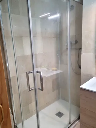Mampara de ducha con diseño moderno y elegante. - Puertas correderas para un acceso cómodo. - Acabado plateado en los perfiles.