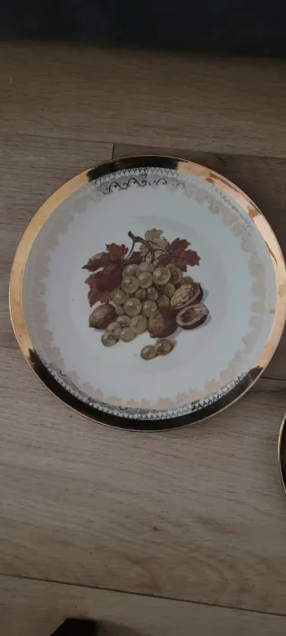 Conjunto de ocho platos de postre con un diseño clásico y elegante. - Cada plato presenta una ilustración diferente de frutas. - Borde dorado que añade un toque de distinción. - Fabricados en porcelana de alta calidad. 24 cm grande y 19 cm