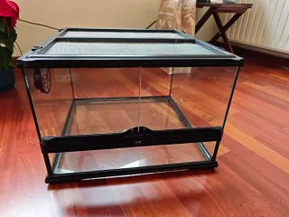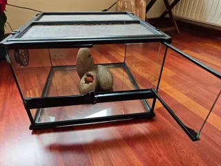 Terrario de cristal con tapa de malla para ventilación. - Puerta frontal con apertura. - incluye decoración, forma de huevos fósiles y fondo de cartón piedra rocoso. *Para geckos terrestre, serpientes, otros lagartos terrestres... Precio original 150€