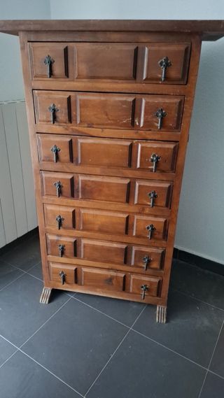 Cómoda de estilo castellano con un diseño clásico y elegante. - Fabricada en madera. - Detalles en cuero. - Tiradores ornamentales.