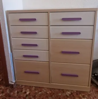 Mueble tipo cómoda con varios cajones. - Diseño de dos columnas de cajones. 9 en total muy espaciosos. - Tiradores de color morado. - Acabado en madera clara. Se vende con armario a juego 320€. Precio conjunto 500€