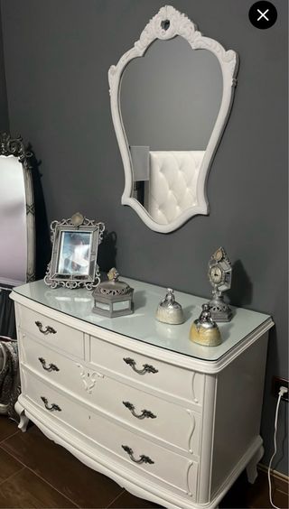 Elegante cómoda antigua de madera, pintada en color blanco. Incluye un espejo a juego. - Diseño clásico con detalles ornamentales. - Tiradores redondos. - Patas curvas.
