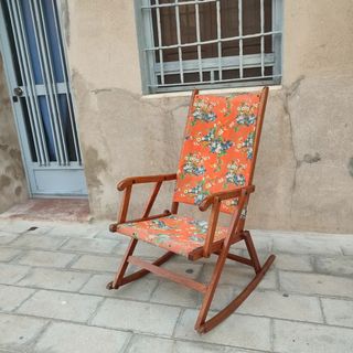 Mecedora plegable vintage, toda de origen sin polillas ni carcoma. Mueble Mid Century con preciosa tela estampada de época. Super cómoda y en muy buen estado. Mueble antiguo usado. Medidas de ancho total 54 cm y ancho de asiento 49,5 cm. x altura 100 cm.