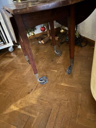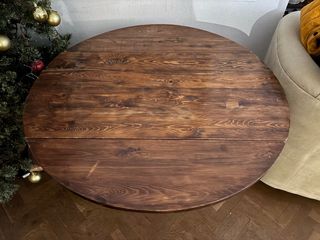 De madera de pino, con terminaciones de latón y ruedas, muy cómoda y practica 99cm de diametro