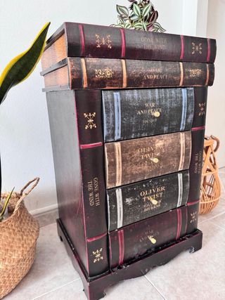 Cómoda con un diseño original inspirado en libros antiguos. - Diseño de Gone With the Wind en la parte superior. - Cajones con títulos de libros como War and Peace y Oliver Twist. - Tiradores dorados. - Estructura de madera.