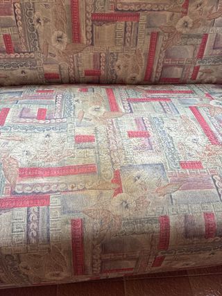 Sofá de estilo antiguo con un diseño de tapicería único. - Tapicería de tela con estampado geométrico y floral. - Tonos beige y rojo predominantes en el diseño. - Estructura de madera. - Brazos acolchados para mayor comodidad.