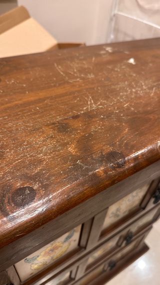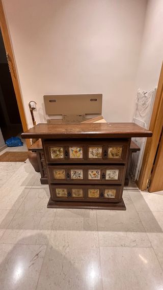 Mueble auxiliar de estilo antiguo, perfecto para añadir un toque clásico a tu hogar. Destaca por su diseño con detalles de cerámica. - Estructura principal de madera. - Frontales de cajones decorados con azulejos de cerámica. - Tiradores ornamentados.