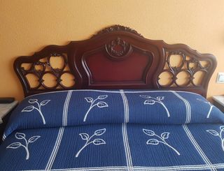 Se vende dormitorio antiguo compuesto por cama con cabecero y pies (no salen en las fotos los pies pero esta guardado junto con los varales de madera),2 mesillas de noche ,un espejo ,una cómoda y un armario de 6 puertas . Encima de las mesillas y la cómoda lleva una piedra de mármol blanco con betas negras . Para saber las medidas mandarme un mensaje.