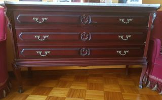 Elegante cómoda clásica de madera con tapa de mármol original, acompañada de dos mesillas a juego. Conjunto de estilo francés con frente curvo, tallas decorativas y tiradores de latón. Muy buena calidad de madera y estructura sólida. Ideal para dormitorios, casas con decoración clásica o proyectos de restauración. El mármol está en buen estado y las piezas conservan todo su carácter original. Se vende el conjunto completo (cómoda + 2 mesillas). Procede de vaciado de vivienda.