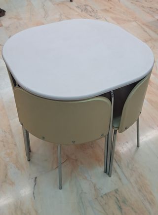 Mesa de 85x85 y 77 cm de alto, en tablex blanco y patas cromadas. Debajo acompañan cuatro sillas color beig en forma triangular, muy cómodas, de ecopiel ignífuga bordeada con pespunte y patas cromadas igualmente. Todo en muy buen estado y con poco uso. Se vende el juego completo y hay posibilidad de porte según distancia o recoger en nuestra tienda en Colmenar de Oreja. Mejor consultar.
