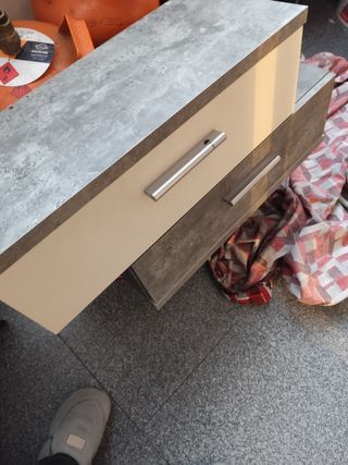 Color gris y blanco.. dos cajones y espejo. Mueble de 53cm de alto x 26 de ancho x 46cm de largo. En buen estado. No sé hace envío. Entrego en persona.