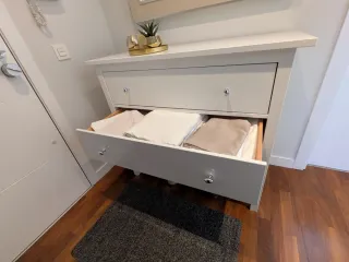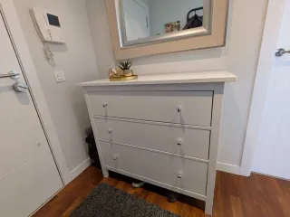 Cómoda HEMNES de IKEA con ocho cajones. Tiradores personalizados. Material Componentes principales: Pino macizo, Adhesivo, Tinte, Barniz acrílico incoloro Laterales de cajón/ Trasera de puerta: Pino macizo, Adhesivo Fondo de cajón: Tablero de fibras, Pintura acrílica Trasera: Tablero de fibras