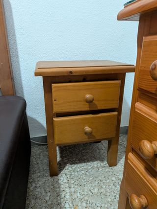 Conjunto de muebles de madera maciza estilo provenzal. Ideal para dar un toque rústico y cálido a tu hogar. Compuesto por: Dos espejos Dos sillas Dos cabeceros un de 90 y otro de 150 Dos mesitas de noche de dos cajones Una comoda de tres cajones Una mesa entradita dos cajones - Acabado en madera de pino. - Diseño clásico con tiradores redondos. Interesados por muebles individuales pregunte precio. No se realizan envios