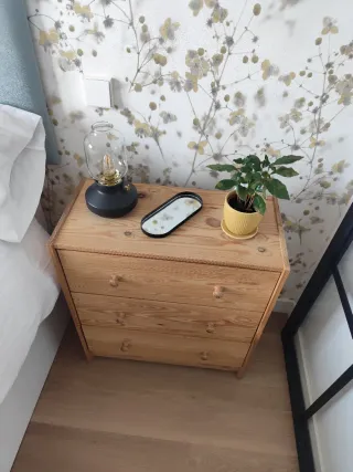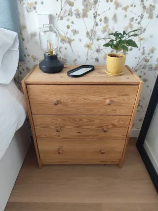Cómoda de madera de IKEA con un diseño clásico y funcional. Sus líneas sencillas se adaptan a cualquier estilo de habitación. - Fabricada en madera de pino. - Acabado natural. - Tres cajones amplios.