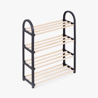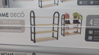 Estantería 4 estantes barras madera. Estanteria de madera de 4 baldas que te ayudará a tenerlo todo organizado. Está fabricada en madera de pino de alta calidad, con estilo moderno y compacto. Gracias a su genial diseño, y a las instrucciones que le acompañan, su montaje será muy sencillo, no necesita tornillos. Los laterales de plástico en color negro le aportarán un toque elegante. Será un fantástico complemento decorativo para su hogar. También podrás utilizarlo como zapatero y ordenar de forma rápida, cómoda y sencilla todos tus zapatos. Medidas aproximadas estantería: 50,5 cm ancho x 64 cm alto x 18,5 cm profundo