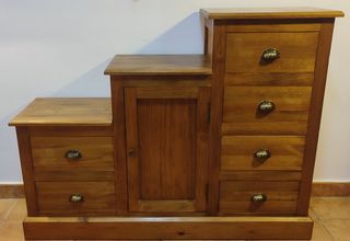 Mueble auxiliar con diseño de escalera y nueve cajones. - Fabricado en pino macizo. - Nueve cajones de diferentes tamaños. - En buen estado aunque a uno de los cajones le falta un tirador, pero es fácil de sustituir.