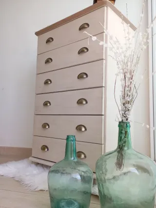 Medidas 65cm de ancho x 39cm de fondo x 101cm de alto. Comoda, cajonera de madera de pino, tiene 7 cajones con más de 30 años de antigüedad, totalmente restaurada, tanto por fuera como por dentro, en color yute y el sobre en tonos chocolates y marrones, con los tiradores nuevos de metal. También tengo a juego el cabecero por 140€, el espejo a partir de 40€ y mesitas por 190€. Hago envíos por toda España, solo pide presupuesto. Toda la decoración también esta a la venta, la puedes ver en mi perfil. Insta: El_rincon_de_arru