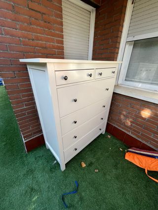 Cómoda de la serie HEMNES de IKEA con seis cajones. - Acabado en tinte blanco. - Medidas: 108x131 cm. La compramos de segunda mano y no calculamos bien las medidas con la ventana. Hay que bajarla de un segundo piso porque no cabe en el ascensor pero ayudamos en ello. Cabe montada en una furgoneta tipo dacia o caddy.