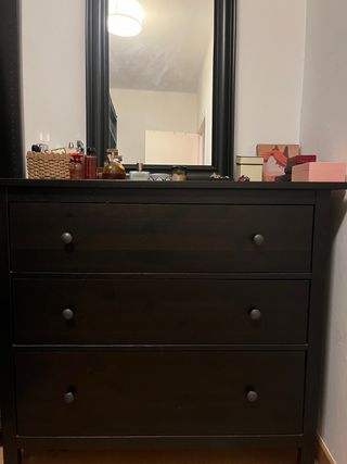 Cómoda de tres cajones de la serie Hemnes de Ikea. Se encuentra en perfecto estado, como nueva. Color marrón-negro. Acepto ofertas razonables. - Diseño clásico y funcional. - Tiradores redondos. - Acabado en madera oscura.