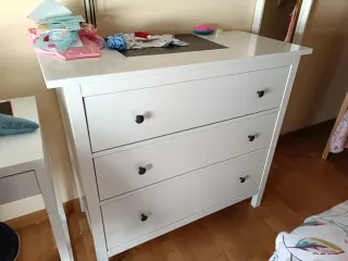 Cómoda de tres cajones de la serie Hemnes de Ikea. Su diseño es clásico y funcional. Está en perfectas condiciones, algún roce como se ve en las fotos. - Tres cajones amplios. - Tiradores redondos.