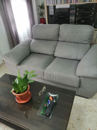 Sofá de dos plazas convertible en cama. Es muy cómodo y ocupa poco espacio. La tapicería está descolorida aunque se le ha dado muy poco uso. Se recoge en Fuengirola.
