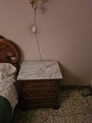 Mueble tocador de madera con espejo y superficie de mármol. También tiene mesita de nocje con marmol. - Diseño clásico y elegante. - Cajones amplios para almacenamiento. Mesita de noche 35€ Cajonera con espejo 50€