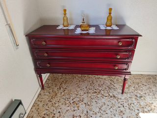 Cómoda de madera lacada en color granate. Presenta un diseño clásico con tiradores dorados. - Acabado lacado brillante. - Tres cajones amplios. - Tiradores decorativos. - Espejo a juego 63x63 cm. Cómoda 40 € (seminueva) y espejo por 25€ (en buen estado). Se venden juntos o separados. Venta por vaciado de casa