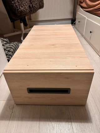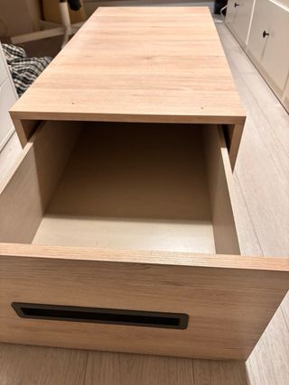 Mueble de almacenaje con un cajón frontal. - Diseño moderno con acabado en madera. - Asa integrada en color negro - Formaba parte de un módulo de debajo de una cama de 90, pero se puede usar solo