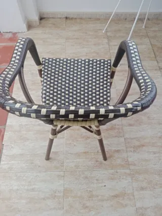 Vendo pack de 4 sillas de exterior con diseño clásico de cafetería parisina. Son muy cómodas, ligeras y están en perfecto estado. Material: Estructura de aluminio efecto madera (no se oxida) y trenzado de ratán sintético de alta calidad. Color: Combinación elegante en blanco y negro/marrón oscuro. Estado: Muy cuidadas, sin roturas en el trenzado ni desgaste por sol. Uso: Ideales para terraza, jardín o incluso comedor de diario. Aguantan perfectamente la intemperie. Precio: 250€ por las cuatro Posibilidad de venta individual: 75€ la unidad