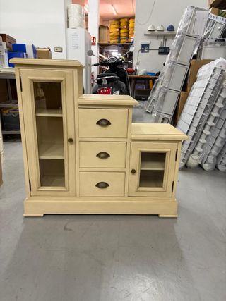 Mueble auxiliar de estilo clásico en color beige. - Dispone de varios cajones y un compartimento acristalado. - Los tiradores presentan un acabado desgastado. -medidas: altura 83cm parte alta 48cm parte baja. Fondo 48cm. Ancho 88cm. -la madera esta en buen estado y los tiradores han perdido color. Precio negociable.