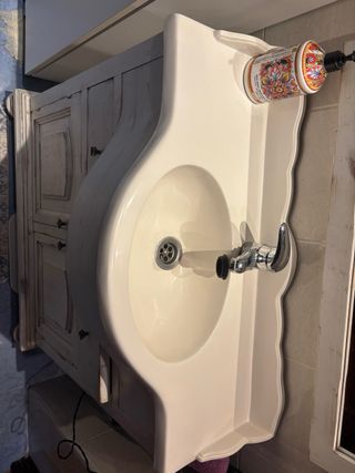 Mueble de baño con un diseño rústico y encantador. - Acabado en blanco con detalles desgastados. - Fabricado en madera. - Incluye lavabo y grifería. Disponible también el espejo a juego.