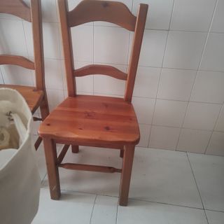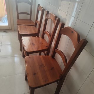 Conjunto de cuatro sillas de madera con un diseño clásico y rústico. - Fabricadas en madera maciza. - Asientos cómodos y respaldos curvos. - Perfectas para comedor o cocina.