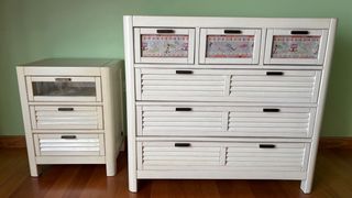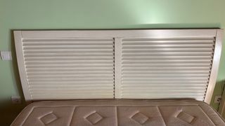 Conjunto de dormitorio de matrimonio en madera maciza lacada blanco roto con diseño de lamas horizontales compuesto por cabecero, 2 mesitas y 1 cómoda. - Cabecero para cama de 150cm. Medidas 162x112cm. - 2 mesitas a conjunto 50x38x65(alto)cm - 1 Comoda a conjunto 100x45x91(alto)cm Está en perfecto estado, el color puede parecer distinto en la foto debido a la luz que le incide. Posibilidad de llevarse la base de cama tapizada con patas y el colchon si se desea. Precio negociable.