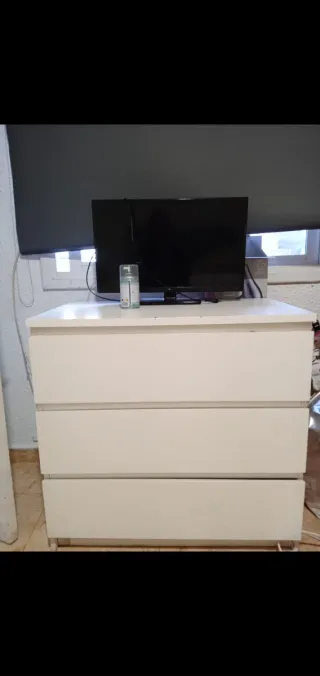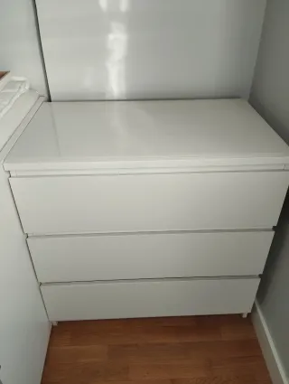 Cómoda Malm de tres cajones de Ikea. Un mueble funcional y elegante para tu hogar. - Diseño moderno y minimalista. - Amplio espacio de almacenamiento. Ha amarilleado un poco el tono blanco por el sol, se aprecia más en los cantos de los cajones, y tuvo pegatinas que han dejado una ligera sombra (foto) pero no influye en su bien estado. Se puede recoger montada.