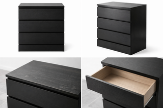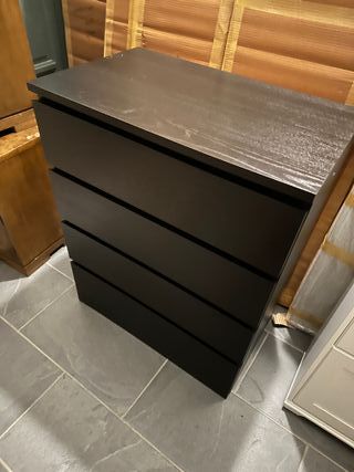 Cómoda IKEA modelo MALM, color negro, con 4 cajones amplios. Mueble sólido y estable. Cajones en buen funcionamiento. Presenta ligeras marcas de uso en la parte superior, normales por el uso (ver fotos). Ideal para dormitorio, vestidor o despacho. Se vende por cambio de mobiliario. Recogida en mano.