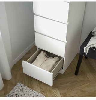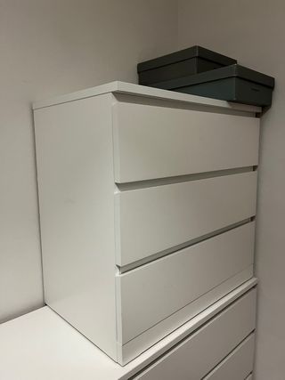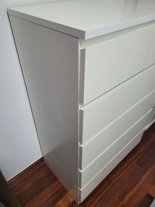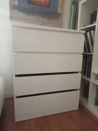 Cómoda MALM de Ikea con cuatro cajones. El único desperfecto está en la tercera foto. Le falta una de las maderas blancas, por lo que se ve el interior del segundo cajón. Funcionalmente está todo perfecto.