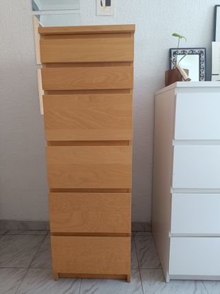 Cajonera de seis cajones de Ikea, modelo Malm. Su diseño sencillo y funcional se adapta a cualquier habitación. - Seis cajones amplios. - Acabado en madera clara.