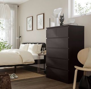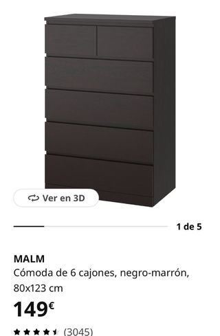 Cómoda de seis cajones de la serie MALM de Ikea. Su diseño moderno y funcional se adapta a cualquier habitación. - Acabado en madera oscura. - Seis cajones amplios para almacenamiento.