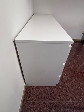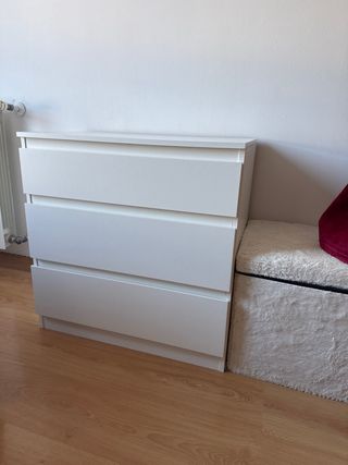 Cómoda de tres cajones de la serie Malm de Ikea. Su diseño moderno y funcional se adapta a cualquier habitación. - Tres cajones amplios. - Acabado liso y fácil de limpiar. - Se ha usado como cambiador, por lo que tiene algún desperfecto que se puede ver en las fotos