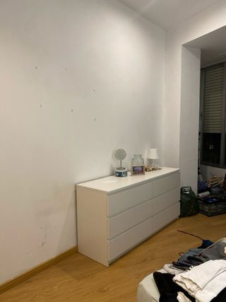 Cómoda IKEA Malm blanca. Medidas: 160 cm largo · 48 cm fondo · 77,5 cm alto. La cómoda es blanca, aunque en el frontal de los cajones tiene puesto papel adhesivo. No está muy bien colocado, pero se puede retirar sin problema. Estado: • El segundo cajón por la derecha está hundido, tal y como se aprecia en las fotos. • Algún cajón no desliza del todo fino, también visible en las imágenes. • Tiene uso y desgaste, ha tenido bastante tralla, de ahí el precio. Ideal si buscas una cómoda grande para restaurar, usar en traste