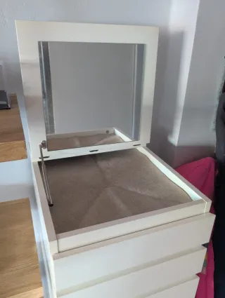 Tiene 6 cajones: 4 cajones grandes y 2 pequeños ideales para accesorios. Debajo del espejo hay un compartimento forrado de fieltro para guardar relojes o joyas. Es perfecta si no cuentas con mucho espacio. Está en buen estado salvo por la parte de los laterales que se ha despegado un poco el laminado. Ver fotos