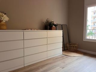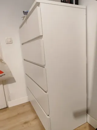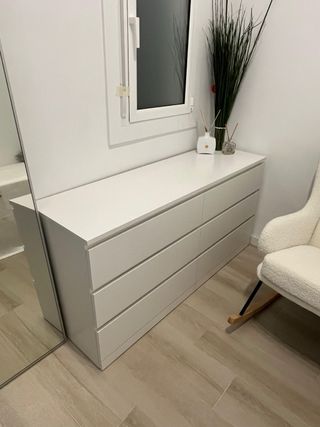 Cómoda MALM de Ikea con un diseño moderno y funcional. Sus líneas limpias y acabado en blanco la hacen versátil para cualquier habitación. - Amplio espacio de almacenamiento. Le falta un embellecedor pero en el ikea si lo pides te lo dan