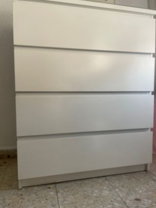 Cómoda Malm de Ikea con un diseño moderno y funcional. Tiene marcas de uso pero funciona correctamente. - Cuatro cajones amplios. - Acabado liso y fácil de limpiar. - Patas discretas para un estilo minimalista.