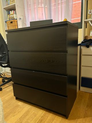 Cómoda MALM de Ikea con cuatro cajones. Su diseño moderno y funcional se adapta a cualquier habitación. Está en buen estado, lo único que tiene algunas rozaduras que salen en las fotos, de ahí el precio. - Acabado en negro. - Fabricada en madera.