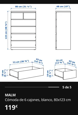 Cómoda de la serie Malm de Ikea con seis cajones amplios. Su diseño moderno y limpio se adapta a cualquier habitación. - Seis cajones de gran capacidad. - Acabado en madera. Está desmontado, excepto los cajones