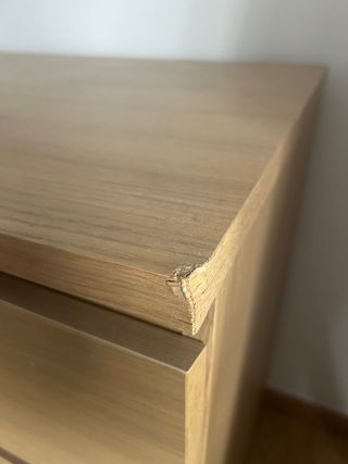 Cajonera de tres cajones de la serie Malm de Ikea. Tiene una madera dañada (como se aprecia en la foto) pero no afecta al funcionamiento. Tiene también un daño cosmético que. Todo lo demás perfecto! Está en un bajo, así que es fácil de recoger