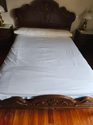 Conjunto de dormitorio de estilo clásico, fabricado en madera. Armario del mismo modelo Comoda con mármol y espejo - Cabecero de madera tallada. - Mesitas de noche a juego. - Base de cama de madera. Cama 1,35 cm